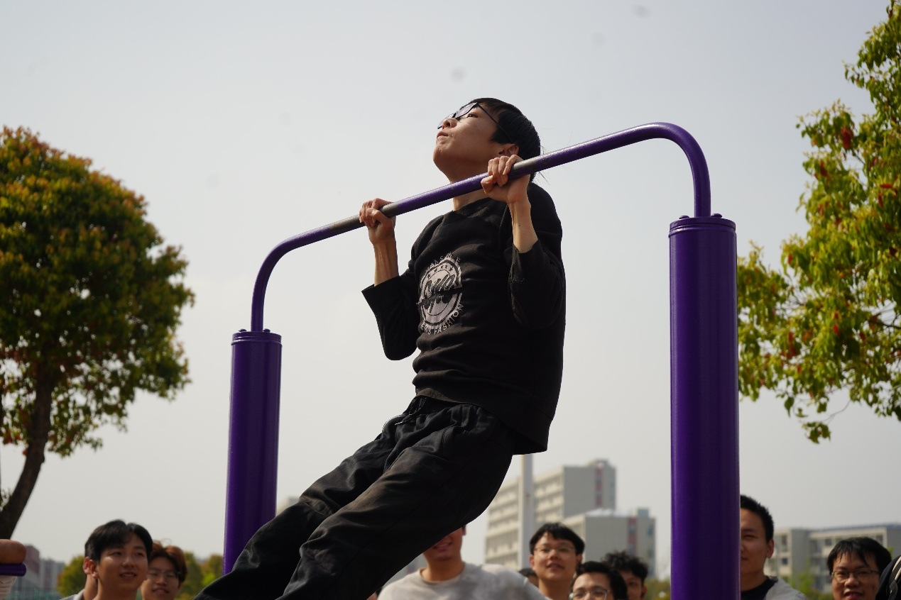 而作为全场对个人体能挑战最大的项目,“引体向上”将现场气氛推向高潮,大家都拼尽全力,只为能多完成一次向上牵引。其中一位同学在完成数次标准动作后,双臂颤抖明显,体力已到达极限,眼看就要脱手落地。就在这时,周围的朋友和同学们齐声高喊“再来一个!加油!”,呐喊声一浪高过一浪。在同伴的鼓舞下,他咬紧牙关,青筋暴起,硬是拼尽全力多完成了一个。落地那一刻,全场爆发出热烈的欢呼与掌声。这多出的一个,不仅是力量的突破,更是友谊与集体温暖的最好见证。
